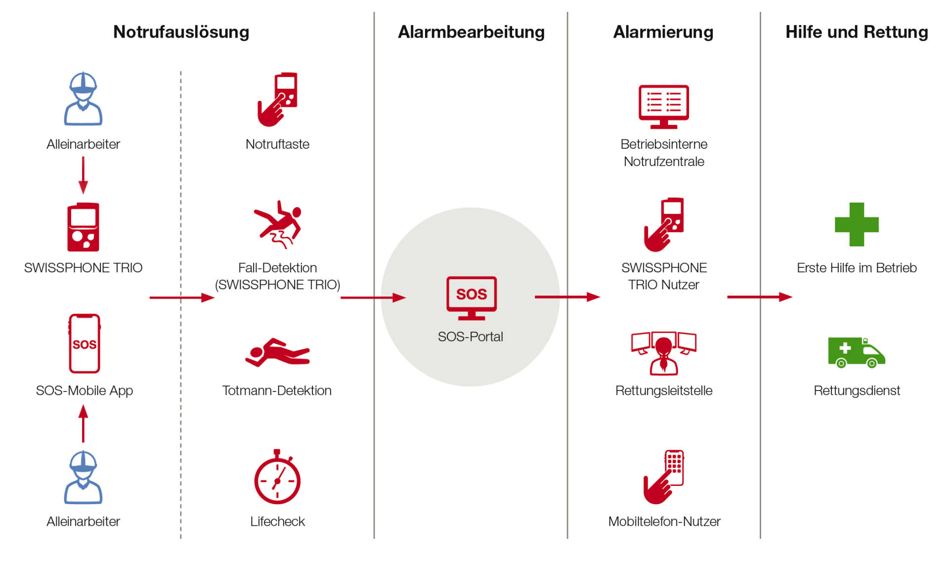 Das SOS-Notrufsystem von Swissphone ermöglicht es, eine Notrufsituation zu erkennen - beispielsweise wenn eine Arbeitskraft sich nicht mehr bewegt. Ist die Arbeitskraft noch Handlungsfähig, kann sie über die Notfall-Taste ebenso einen Notruf absetzten. Wenn der Bewegungssensor feststellt, dass die Person sich in einem festgelegten Zeitpunkt nicht mehr bewegt, wird auch ein Notruf abgesetzt. Das Gerät aktiviert einen gut hörbaren Ton um die Ortung zu erleichtern und das SOS-Portal unterstützt durch einen vordefinierten Rettungsplan.