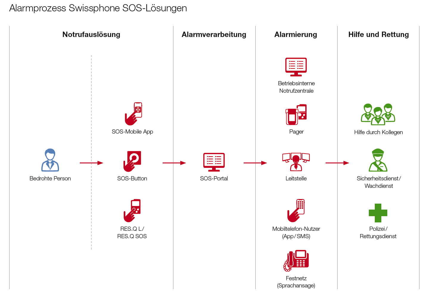 Das Swissphone-Notrufsystem für Bedrohung erlaubt es, in kritischen Situationen unauffällig und rasch einen stillen Alarm abzusetzen oder geeignete Hilfspersonen in Bereitschaft zu versetzen. Die integrierte Lösung bietet sämtliche Komponen- ten – von Auslösegeräten über die Ortungstechnologien und dem webbasierten Notrufsystem (SOS-Portal), bis hin zu den verschiedensten Kommunikationskanälen. Aufgrund der Flexibilität des Systems und der Anpassungsfähigkeit der Pro- zesse sind sämtliche Szenarien – kleine oder grosse Nutzer- zahlen – integrierbar. Die Lösung bietet die höchst mögliche Sicherheit: Dank einer diskreten Rückmeldung des Auslöse- gerätes weiss die bedrohte Person, dass der Ruf angenom- men wurde und Hilfe naht.